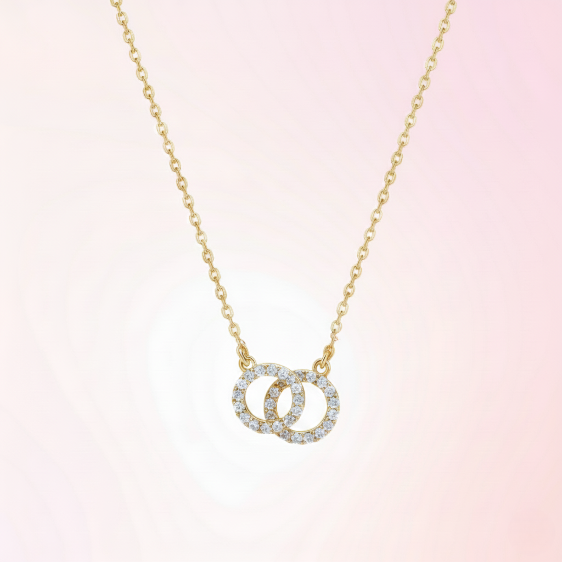 The delicate interlocking double-circle design, accented with pavé stones, symbolizes luck, companionship, and meaningful connection, resting elegantly close to the heart.
